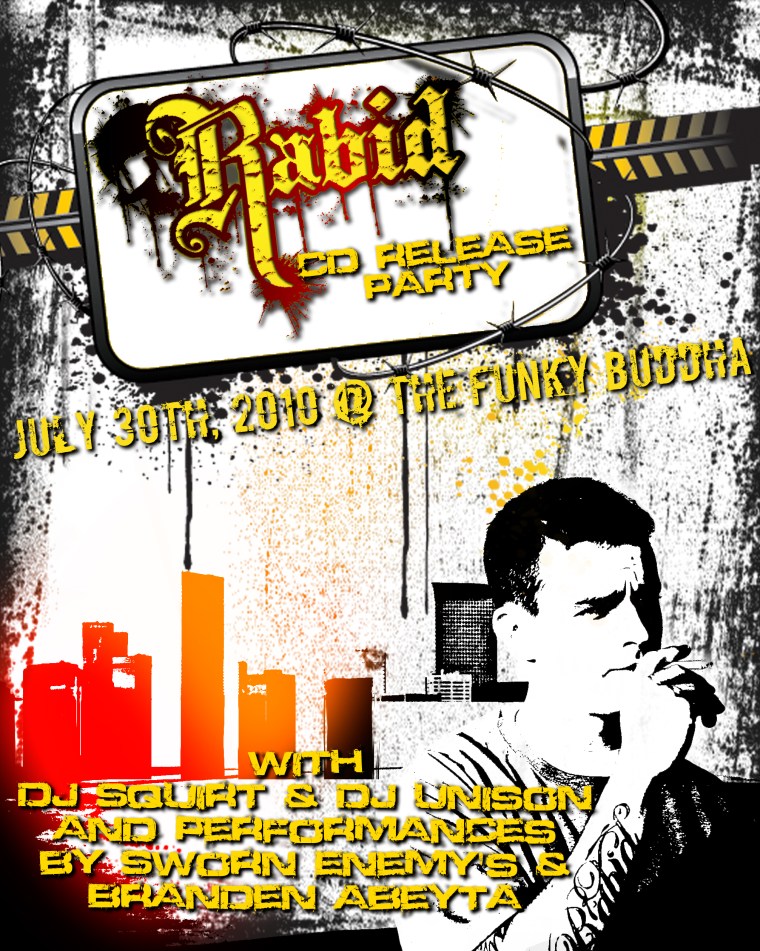 This Friday I’ll be rockin the Funky Buddha for Rabid’s Album Release Party with Rabid, DJ Unison, Sworn Enemy’s, and Branden Abeyta! Can’t wait! Share this: Click to share on Facebook (Opens in new window) Facebook Click to share on X (Opens in new window) X Like Loading... Related Leave a comment Cancel reply Δ Post navigation Previous Previous post: Steppin it upNext Next post: Space Squirt Lazers Art